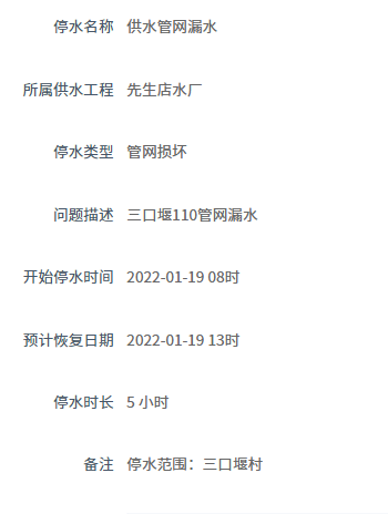 先生店水厂停水信息【2022-1-19 08时——2022-1-19 13时】