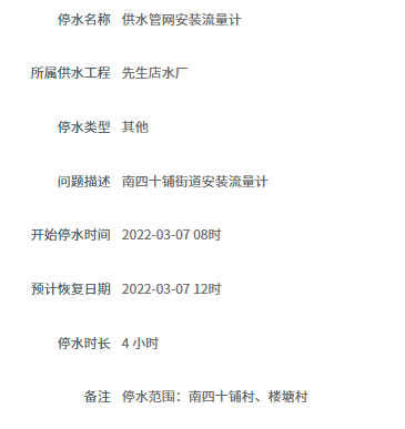 先生店水厂停水信息【2022-03-07 08时——2022-03-07 12时】
