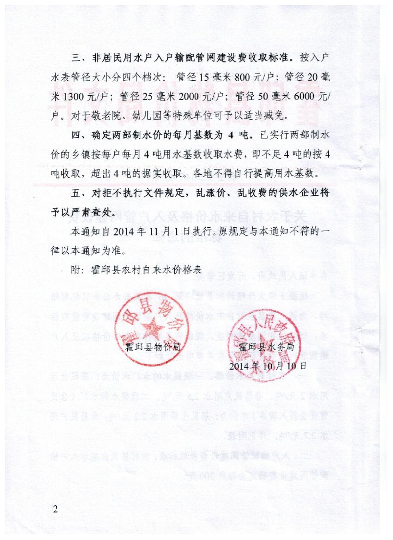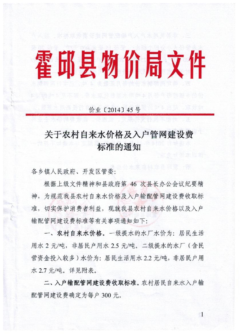 霍邱县物价局关于农村自来水价格及入户管网建设费标准的通知
