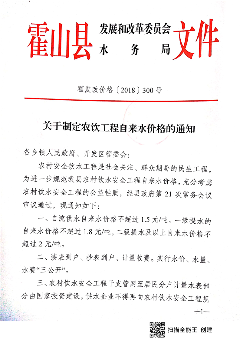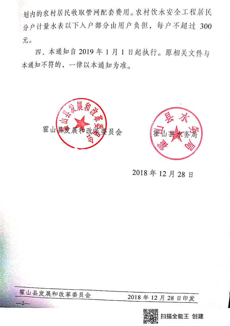 霍山县发改委 霍山县水务局关于制定农饮工程自来水价格的通知