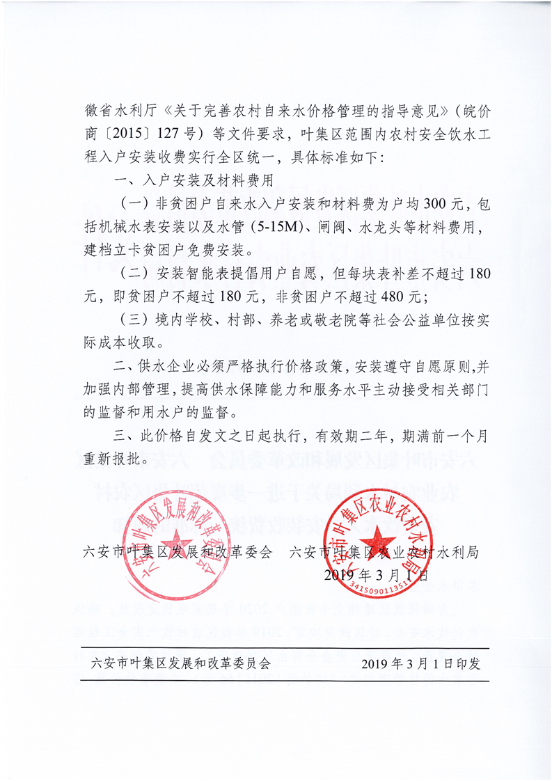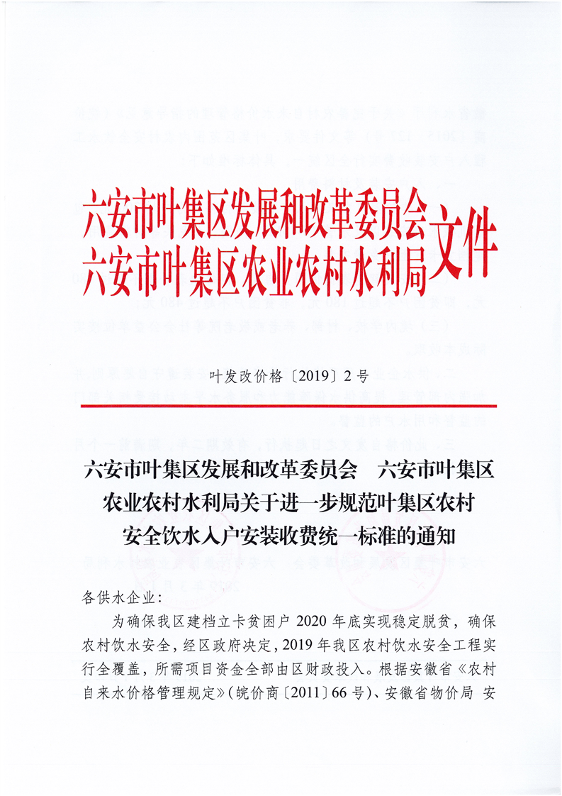 叶集区发改委、叶集区水利局关于进一步规范叶集区农村安全饮水入户安装收费统一标准的通知
