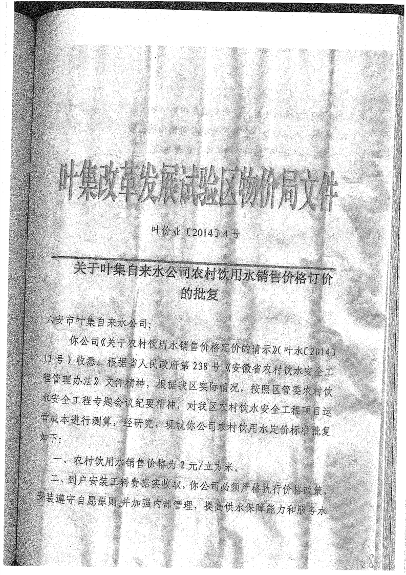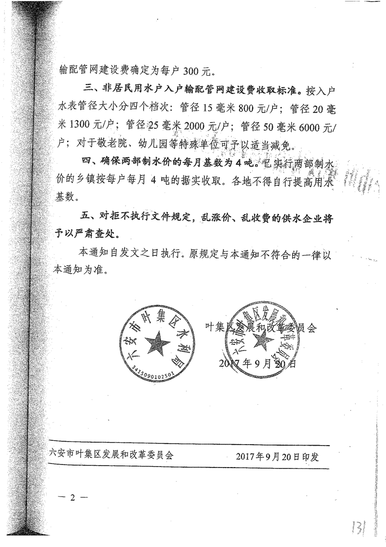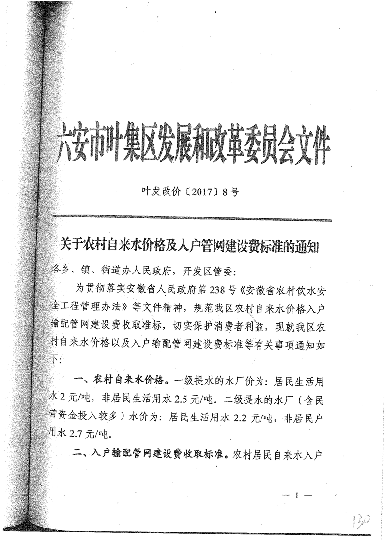 叶集区发改委关于农村自来水价格及入户管网建设费标准的通知