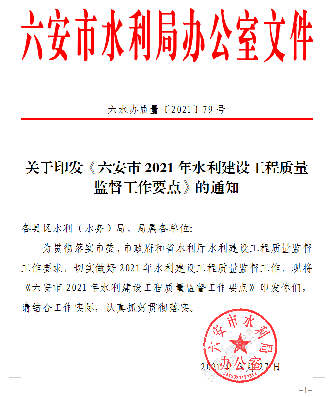 关于印发《六安市2021年水利建设工程质量监督工作要点》的通知.doc